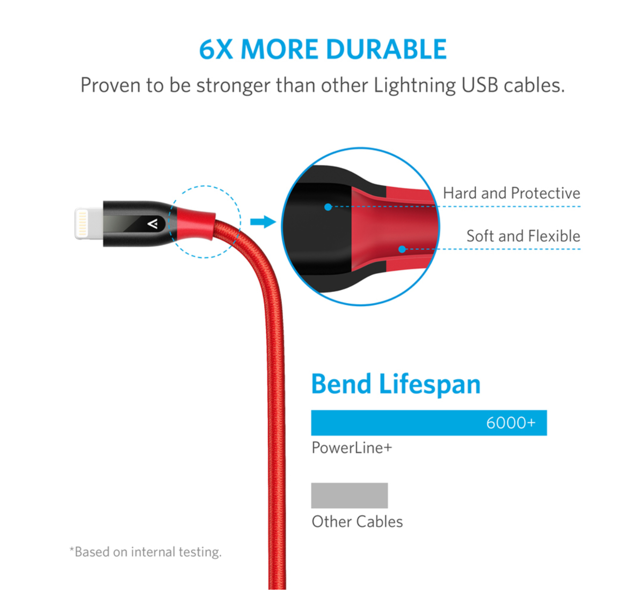 6000回以上の折り曲げテストに耐えたPowerLine+は一般的なケーブルの6倍の強度。溶接加工をしているコネクタ部分は切れることはまず無いはず。