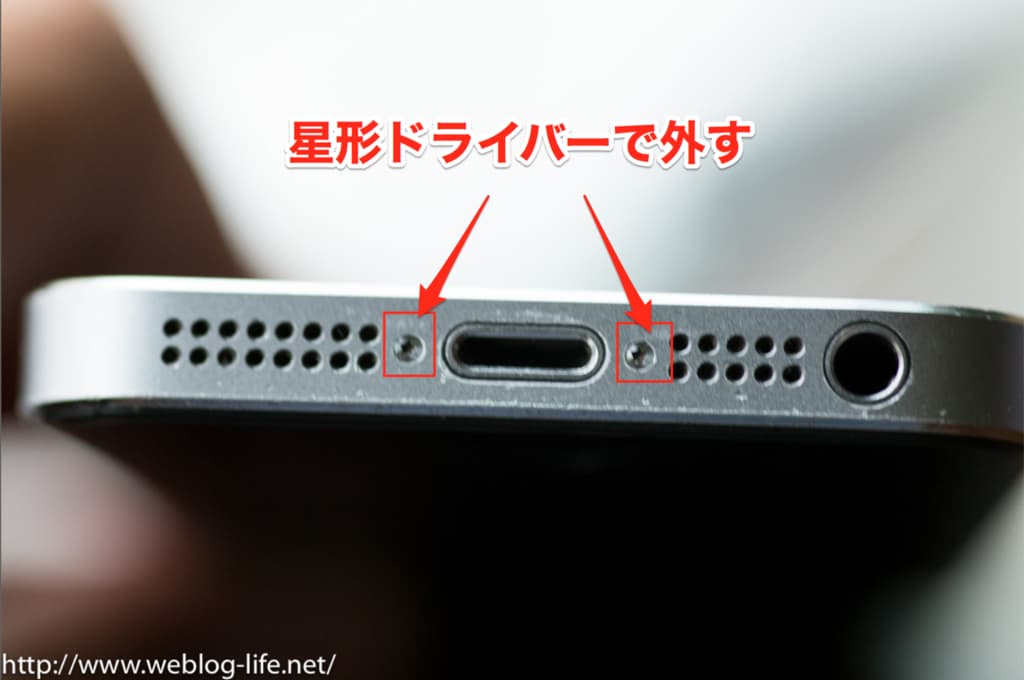 まずiPhoneの電源をオフにして、iPhone下部のドックコネクタ両端のネジを星形ドライバーで取り外します。