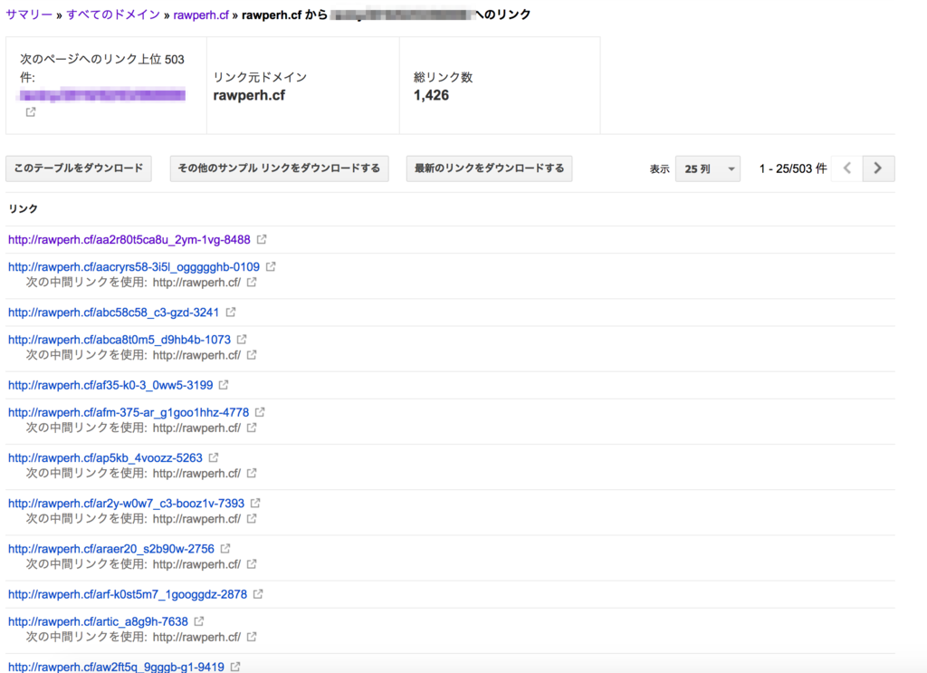 正常なリンクが一番問題で、ほとんどがこのスパムサイトの内部リンクですが一部こちらのリンクがあります。(だからSearch Consoleに出たのですが)