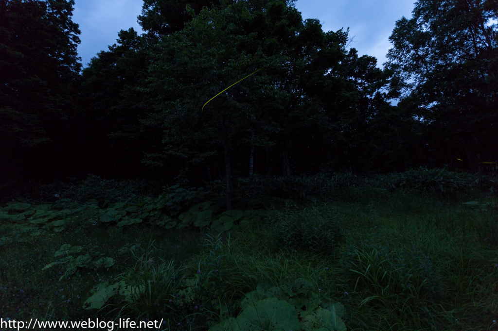ちなみにムスメもわたしが以前使っていたAPS-Cの一眼レフで撮っていたのですが、こんな感じでした。おもいっきり三脚が入ってる(笑)でもほたるの軌跡はばっちり入ってます!