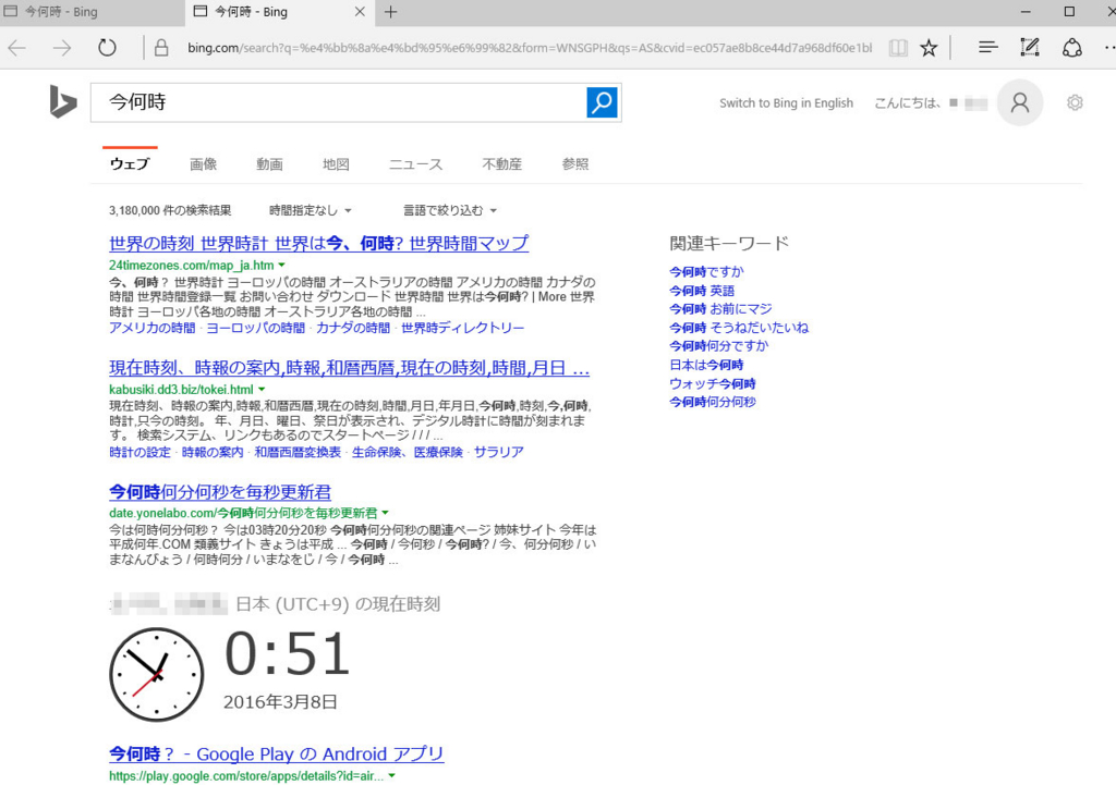 聞いたところブラウザが開いた・・・。上の画面で「今何時 Webを検索」となっている場合はブラウザが開いてしまいます。Cortanaさんと対話形式でやりとりする場合は「チャットしましょう」と表示されます。